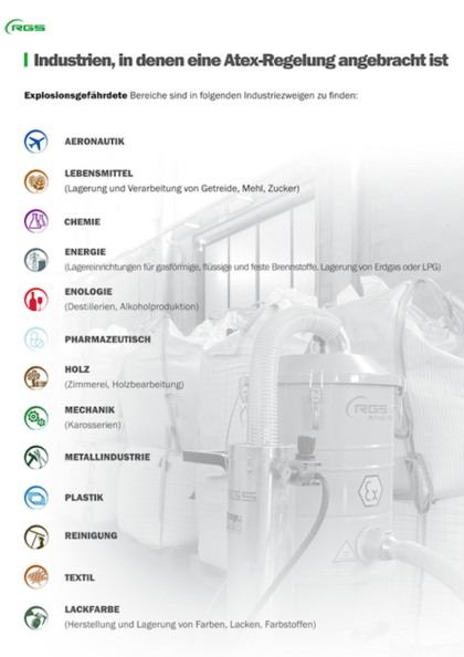Die Baureihe der Atex-Sauger kann in Bereichen eingesetzt werden, in denen aufgrund des Vorhandenseins von explosiven Stäuben oder Gasen Explosionsgefahr besteht. Es gibt Maschinen, die speziell für Bereiche mit Staub, mit dem Suffix "D" oder für Bereiche mit Gas und Staub, mit dem Suffix "GD" ausgelegt sind.